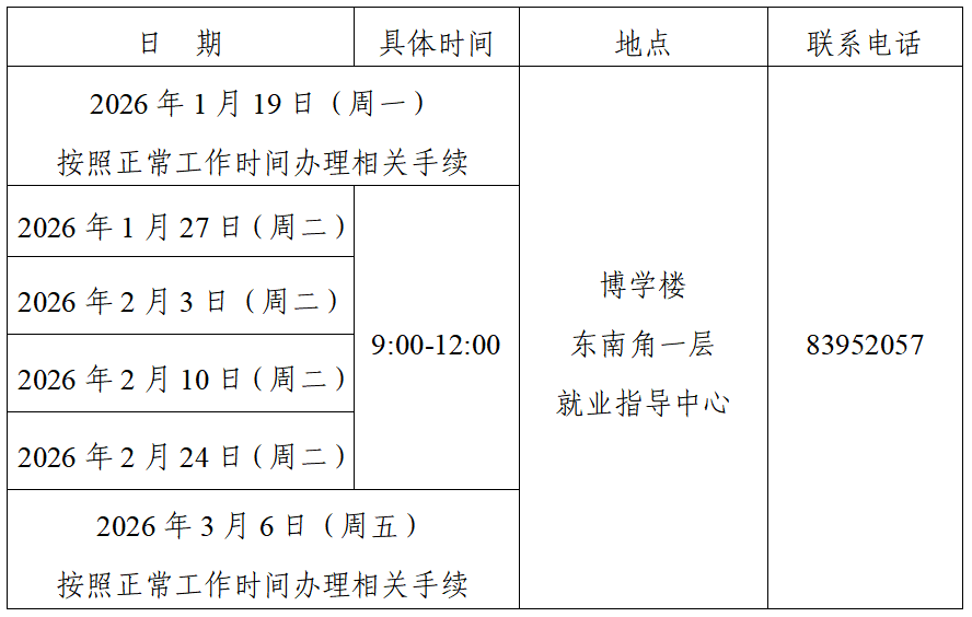 为方便同学们寒假期间办理各类就业手续以及咨询就业相关问题,根据学校寒假的时间(1月20日-3月7日)安排,学生处就业指导中心将在寒假期间安排专门时间值班,请同学们根据通知合理安排时间,以免耽误办理后续手续。具体办理时间地点和办理事项安排如下: