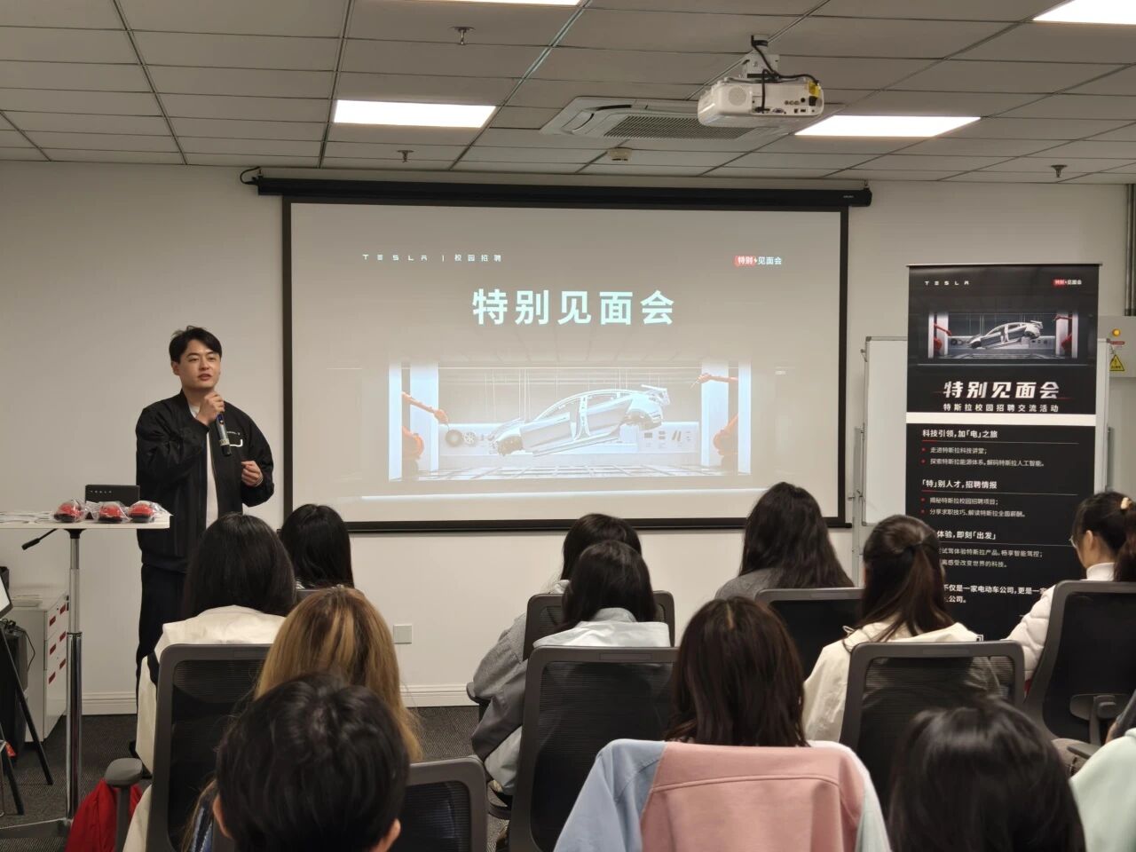 在校招分享环节,特斯拉校园招聘负责人介绍实习生项目及应届生招聘计划,涵盖研发制造、IT、销售、交付、服务等方向。他结合实际案例讲解简历投递、面试评估的要点,鼓励学生在求职中主动探索、积累实践经验,展现了科技企业的人文关怀与广阔发展空间。