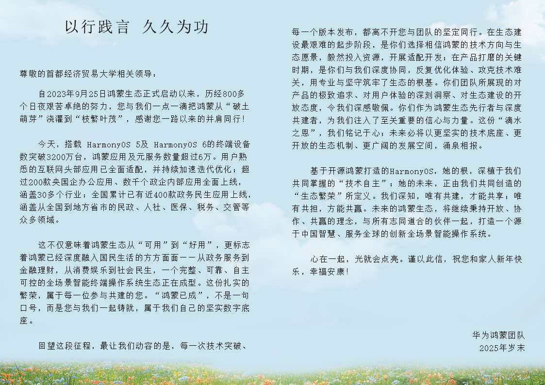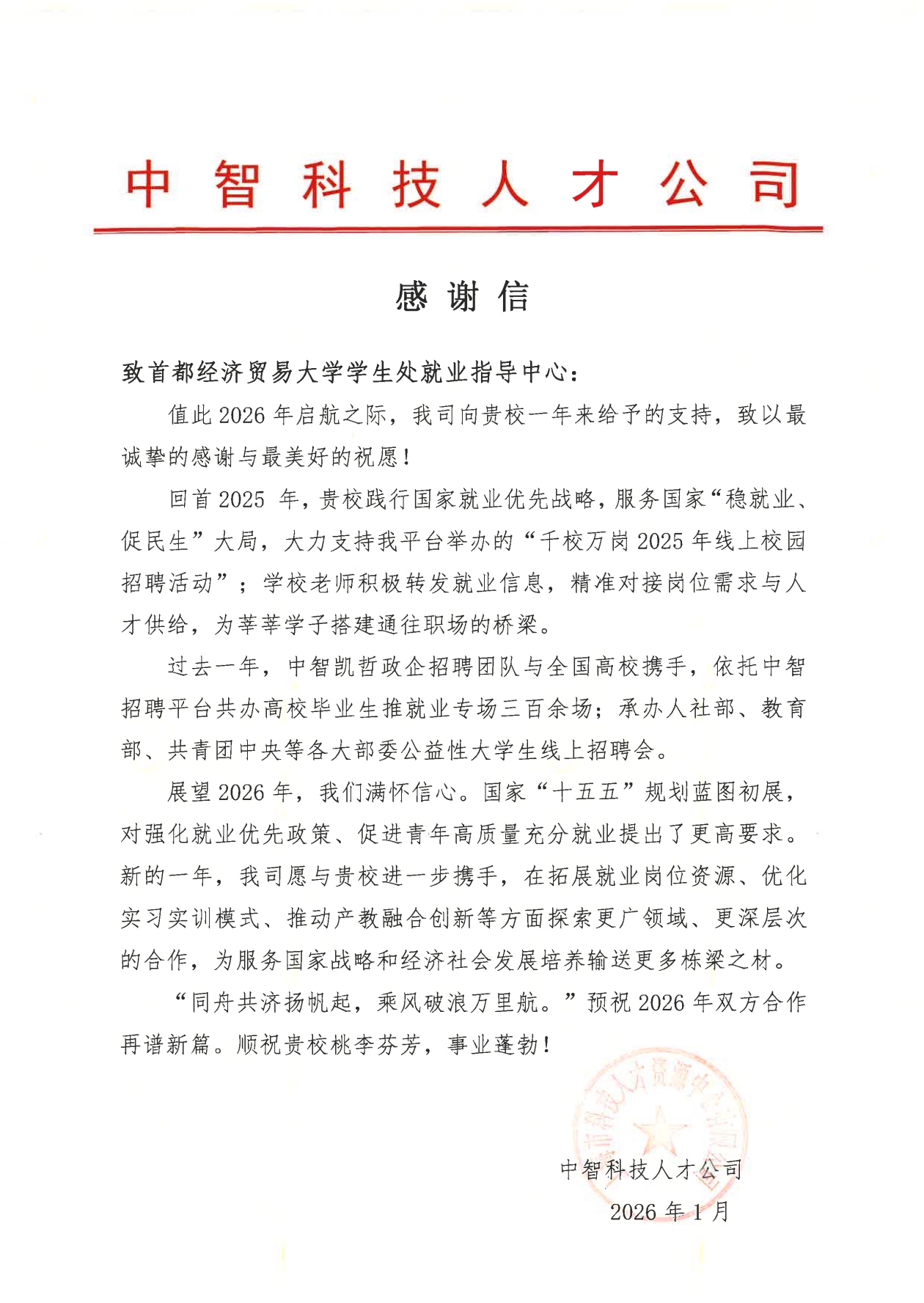 岁末年初,首都经济贸易大学收到多封来自合作单位的感谢信。2025年12月19日,智联招聘联合北大国发院主办2025年度最佳雇主颁奖典礼,我校获“2025年度最佳高校 知行共育奖”。水利部人才资源开发中心、中智科技人才公司、华为鸿蒙团队、毕马威中国人力资源校招组等多家企事业单位,纷纷向学校在过去一年对其招聘与人才合作工作给予的全力支持与高效协同表示诚挚感谢,并表达对未来深化合作的期待。来信及奖项表达了对我校就业服务工作的高度认可,更是校企双方紧密协作、共育英才的生动见证。